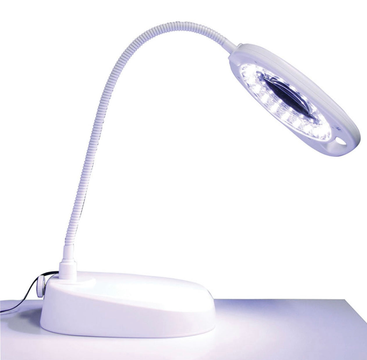 21 bright LED's for powerful illumination. Accessories tray - INCLUDED. Flexible goose neck with tilt functionality. Integrated switch and handle on lamp head. AC/DC adapter included. 2 x magnifier.