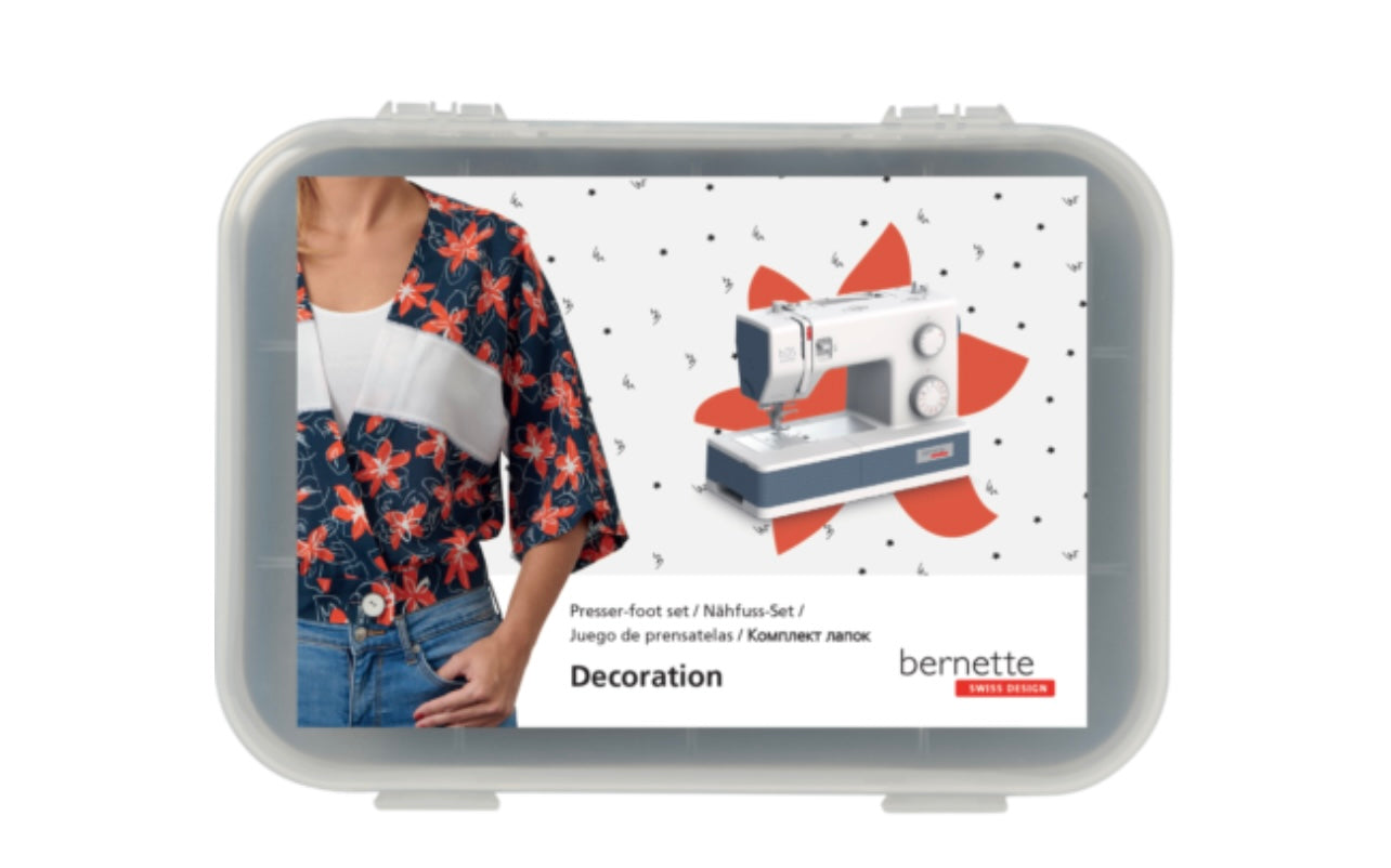 This set for the sewing machines b05 ACADEMY as well as selected models of the sew&go and Milan series contains the following 9 presser feet for special stitches and decorative projects: