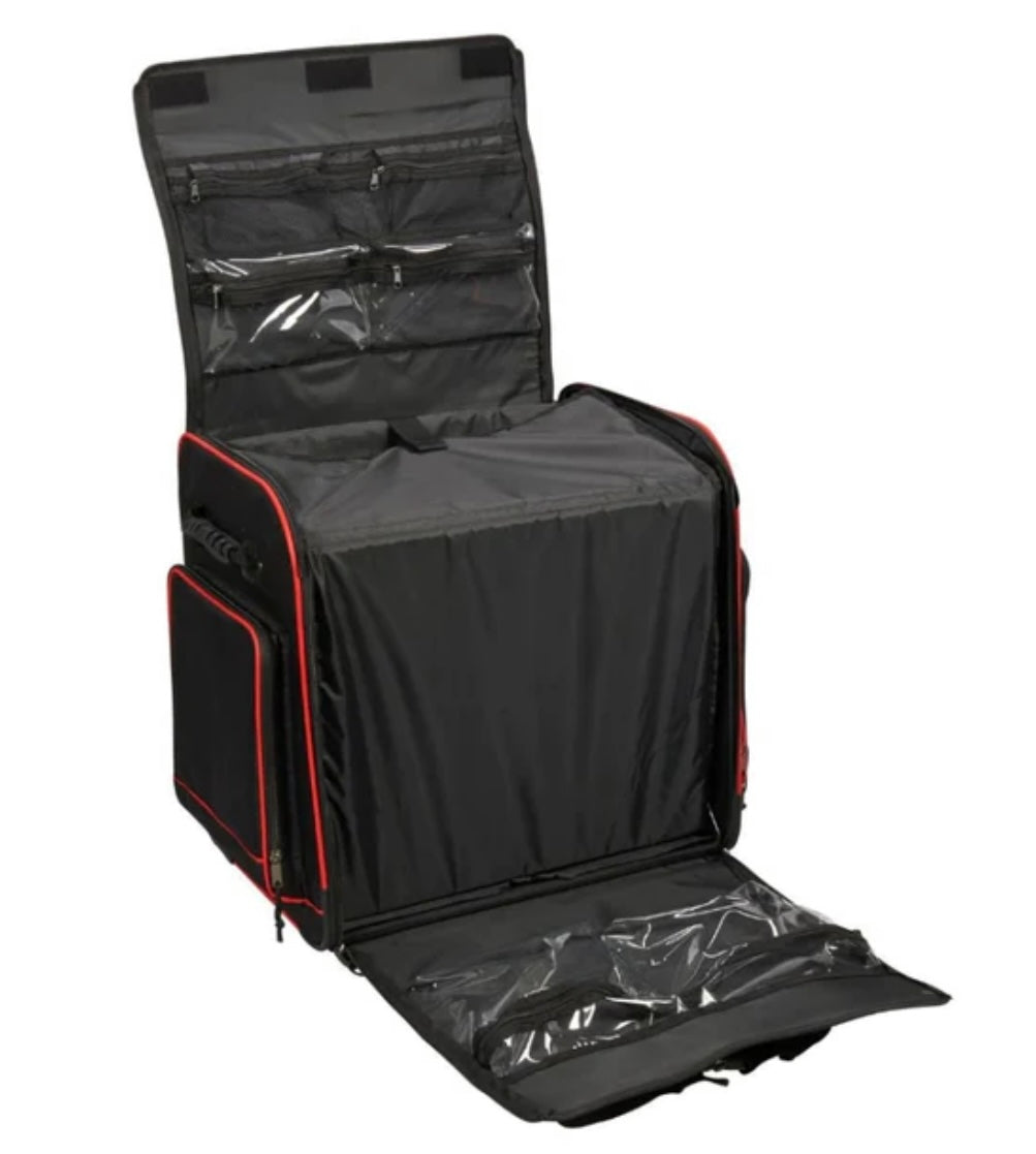 The practical Trolley is very sturdy and perfectly suited when you are en route. The long zipper opens at the front for comfortable loading and unloading of the machine. The inner and outer pockets provide a lot of space for accessories. Due to the robust wheels and the retractable telescope handle, the full Trolley can be pulled comfortably. The sideway handles allow a convenient loading and unloading of the trolley. Also, a separate wrap protects the accessory boxes.