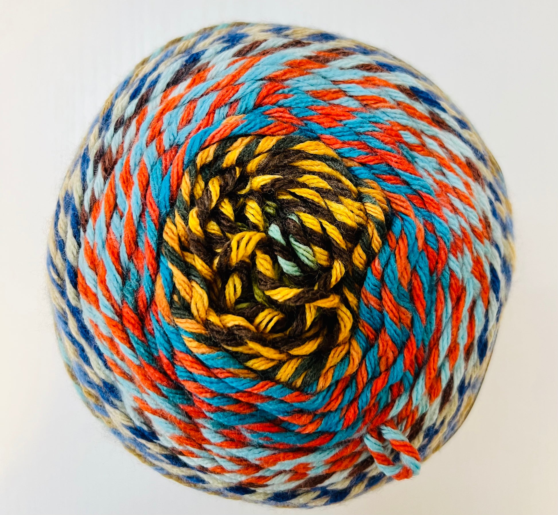 Thick multi-ended yarn created for making colourful accessories using only 1 ball of cake type yarn. Thanks to the rounded structure of the yarn, formed by 2 different long cycle prints twisted together, each ball of yarn is unique. Knit or crochet simple and fun projects, quickly and without too much effort in amazing colour combinations. We are sharing a double neck warmer crochet pattern using only one ball of yarn and a simple sleeveless jumper using two balls of yarn.