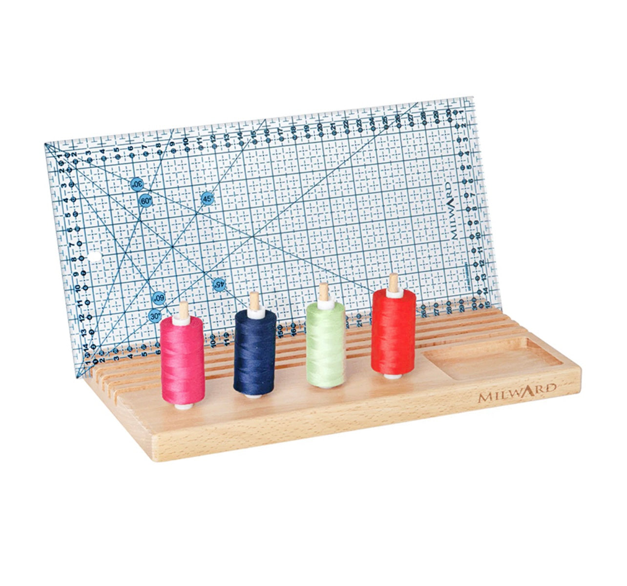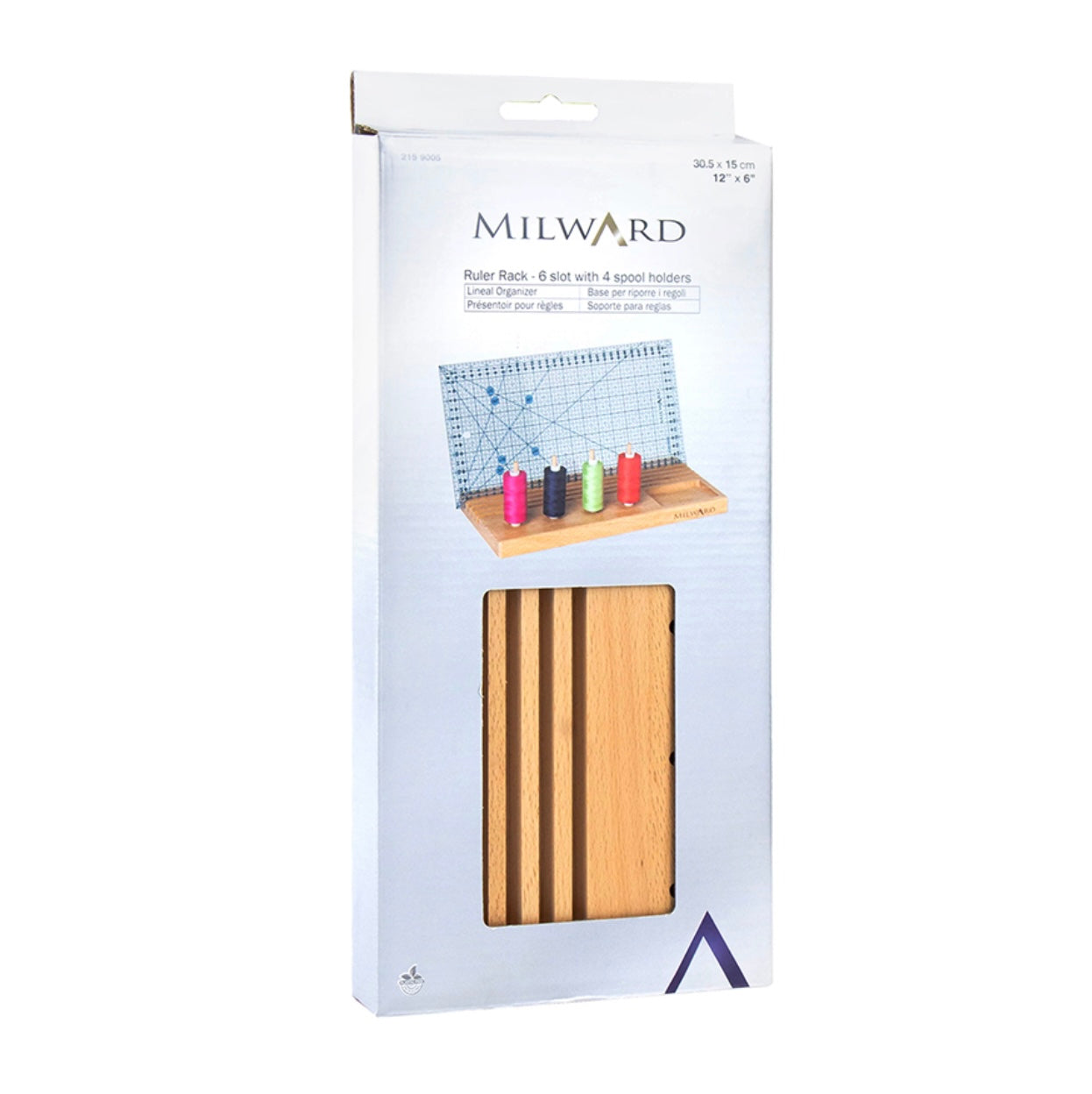Store your quilting rulers or templates using this ruler rack. Display threads on front pegs and pins and clips in the front carved compartment. Pads are stuck on the bottom of the rack to prevent slipping. Made from durable beech wood with a smooth finish. Laser etched with the Milward logo.