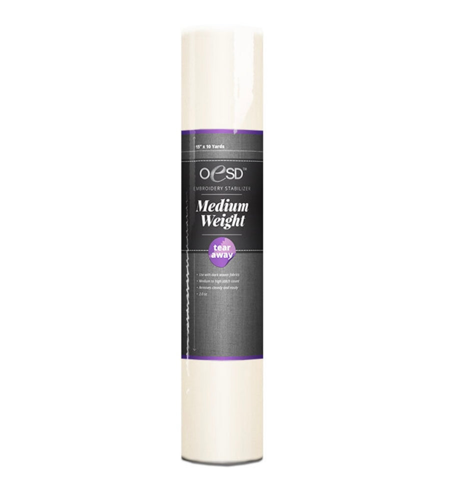 Medium Weight TearAway 15" x 10yd for medium to high stitch count. Removes cleanly and easily.