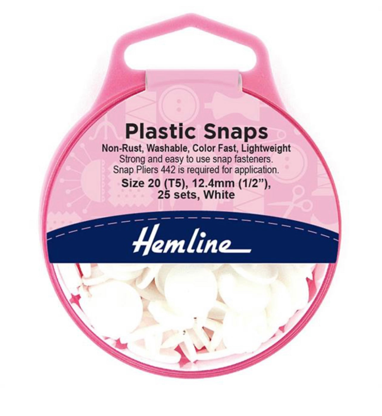 Hemline Kam Plastic Snaps are non-rust, washable, colour fast, lightweight, strong and easy to use snap fasteners. They are very convenient snaps for baby bibs, diapers, baby clothes and other clothes. Size: 20 (T5) with a diameter of 12.4mm is best suited for heavy fabrics. Snap pliers 442 is required for the application. Snaps set contain 25 pieces.